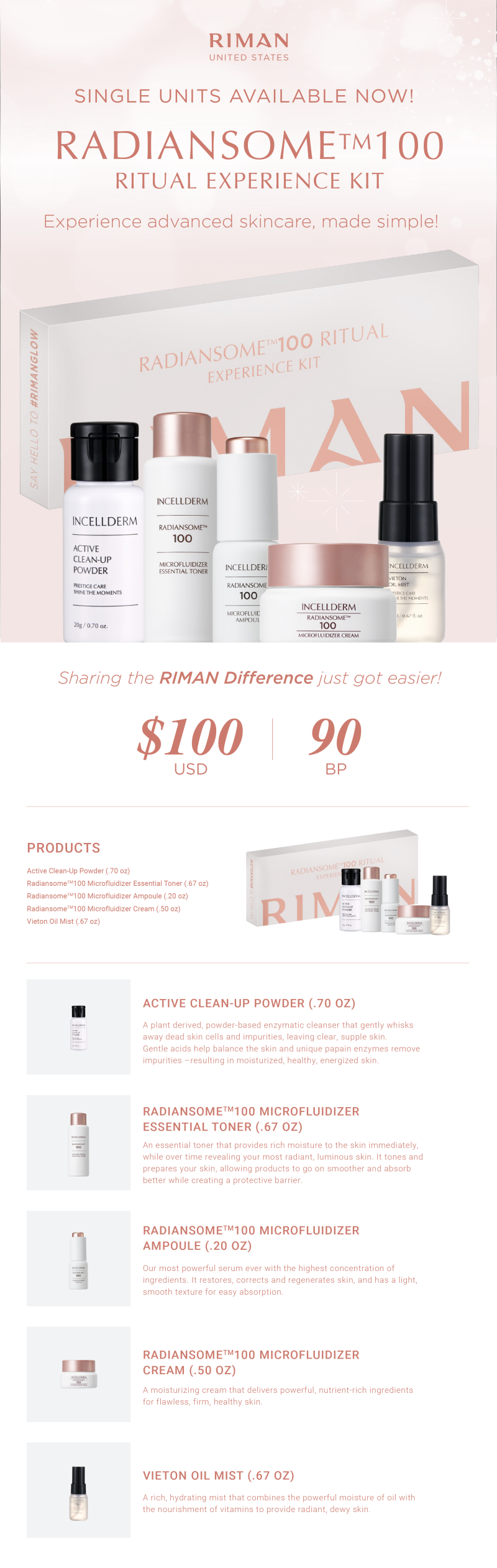 This shareable, 5-piece set contains travel sizes of the bestsellers from our Advanced Radiansome line, all packaged in an elegant giftbox featuring simple how-to instructions and product benefits!